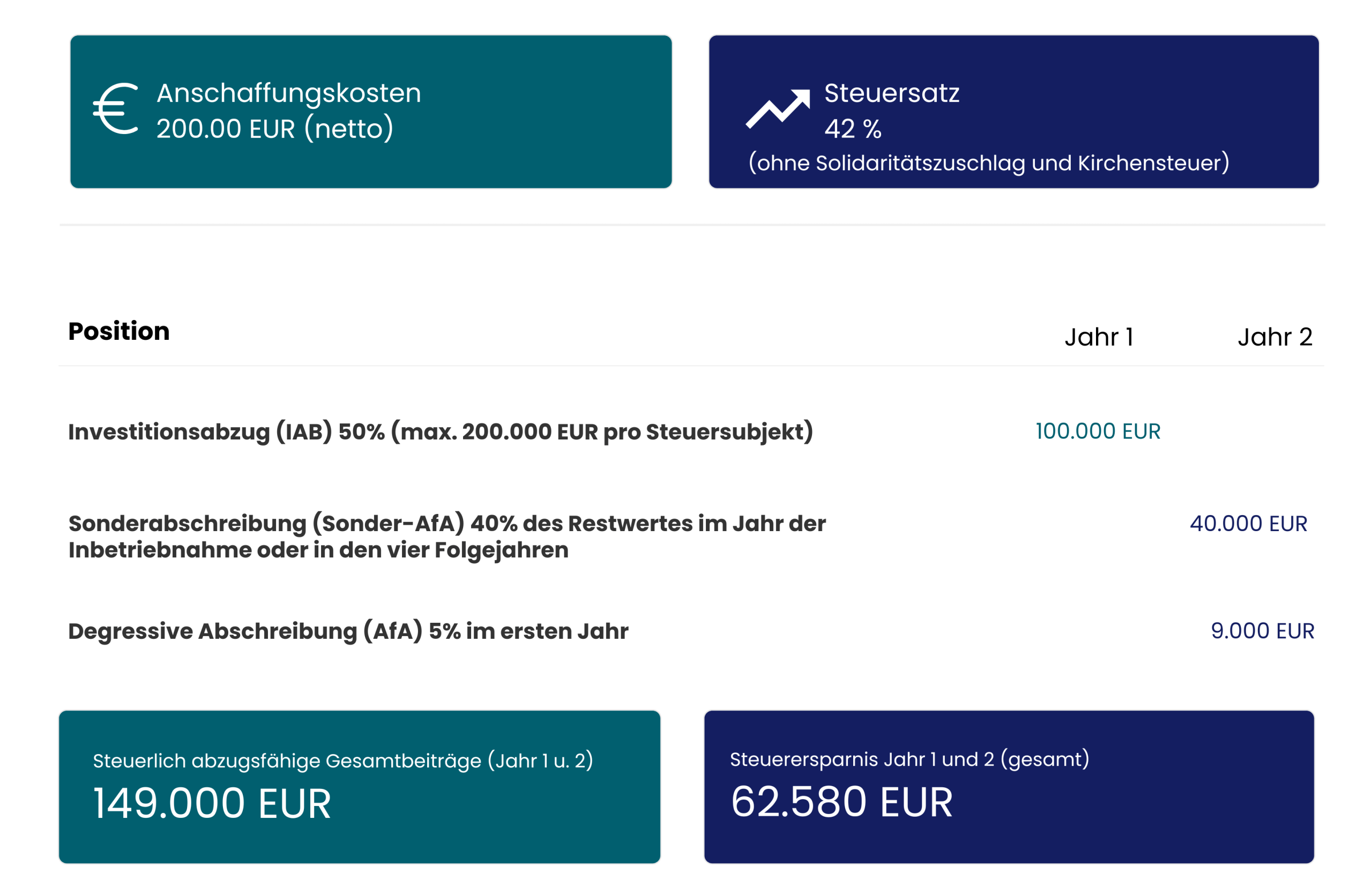 Mit dem IAB können bis zu 50 % der Investitionskosten vorab steuerlich geltend gemacht werden, zuzüglich Sonder-AfA (40 %).